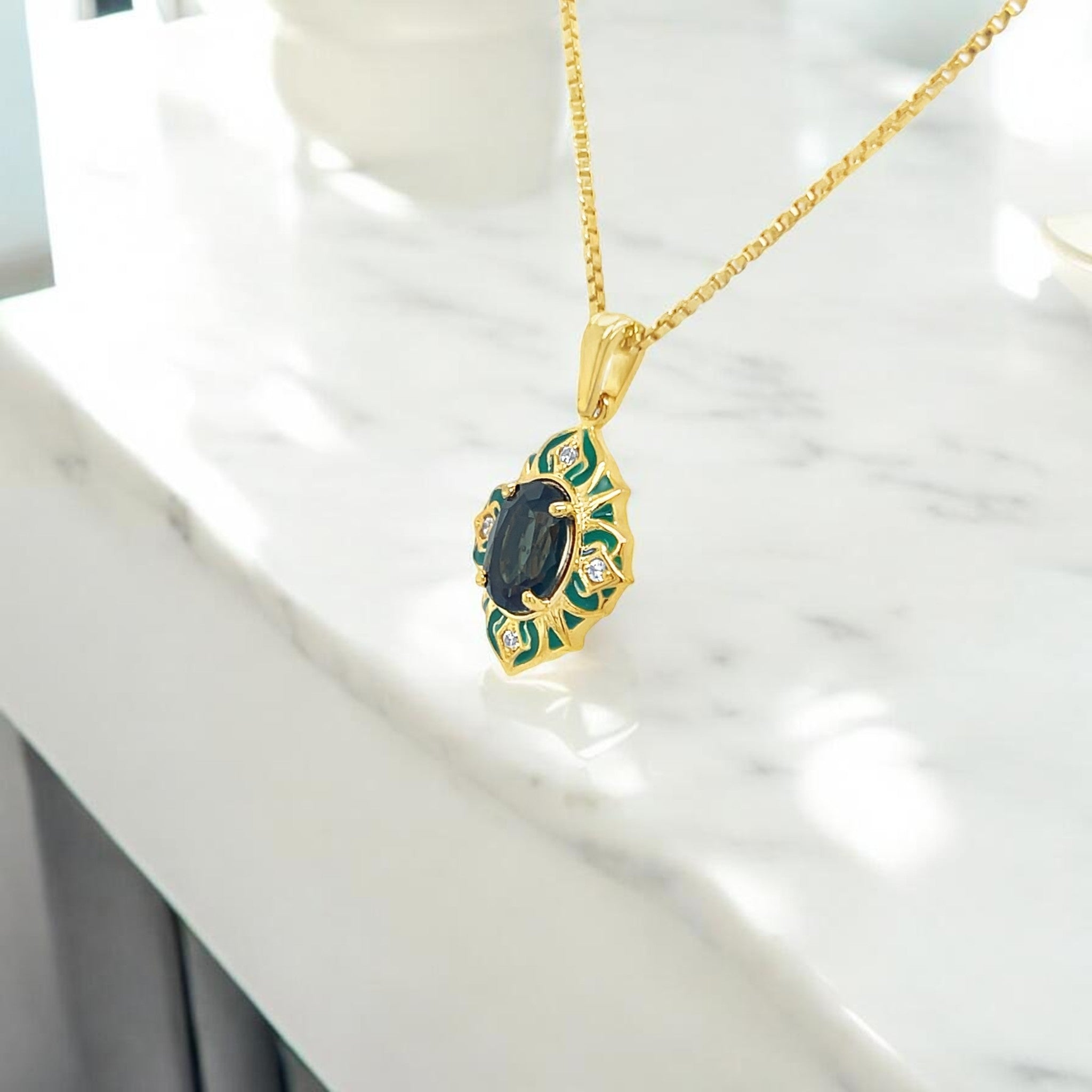 The intricate green enamel detailing adds a unique and artistic touch, perfectly complementing the luxurious yellow gold plated 925 sterling silver setting. This pendant comes complete with an 18-inch box chain secured by a reliable lobster claw clasp, making it ready to wear or gift.