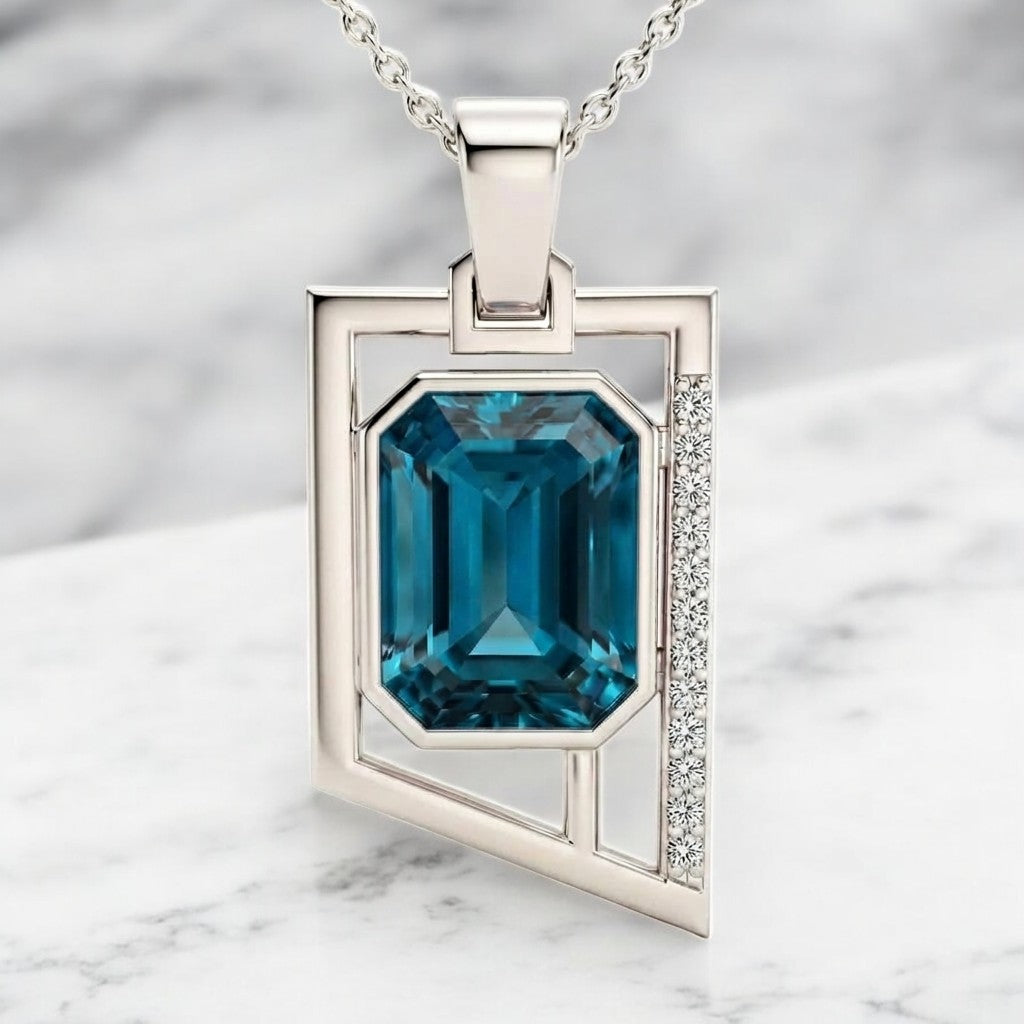 Refresh availabilityThis sophisticated pendant showcases a stunning 10 x 8 mm emerald cut London Blue Topaz as its focal point, complemented by twelve round white zircon accents totaling 0.06 ctw. Crafted in 925 sterling silver with meticulous bezel setting, the asymmetrical design creates visual intrigue while maintaining elegant balance. The adjustable 16-20 inch cable chain with secure lobster claw clasp ensures versatile styling for any occasion. A refined piece that elevates your everyday collection with gemstone brilliance and timeless craftsmanship.